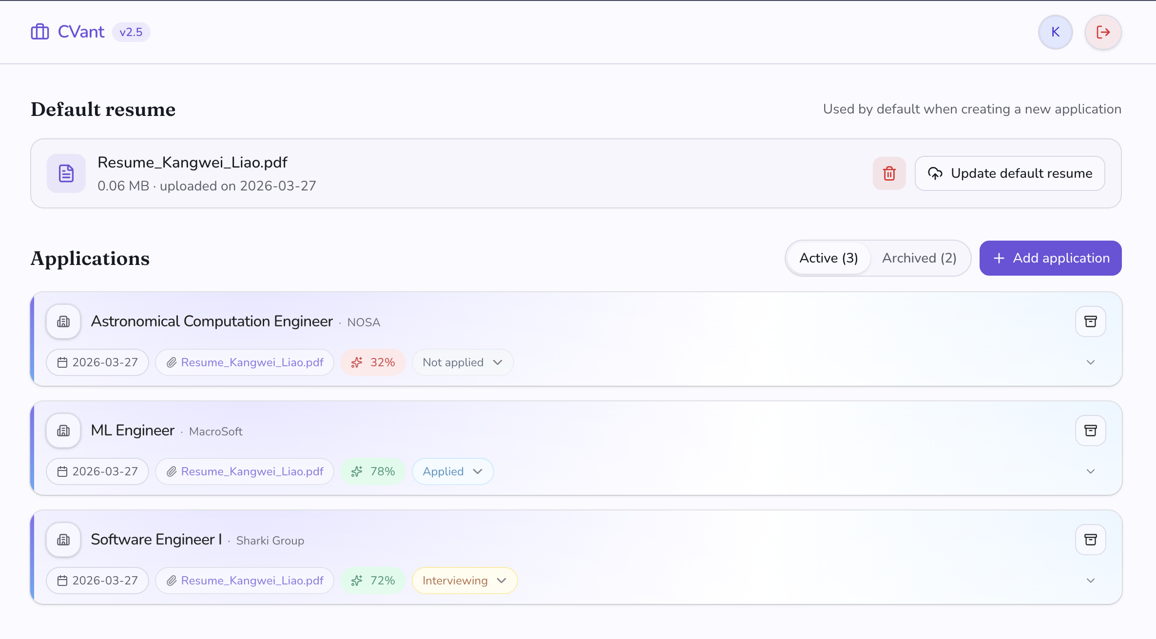 Job hunting at volume is a project management problem: dozens of tailored resumes, each tweaked for a different JD, and no reliable way to remember which version went where. CVant is a workspace that solves exactly that — track applications, manage resume versions, and let an LLM tell you how well each resume matches the role. No duct tape, no spreadsheet, no "half the context is buried in a Discord thread."