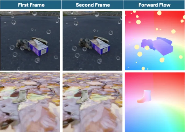 In the raindrop case, parts of the scene become partially unreadable, and the flow map reflects that complexity at boundaries and around occlusions. In the cleaner case, motion is easier to follow and the flow stays smoother. Having both under the same scenario taxonomy is what lets you separate “the model can’t handle rotation” from “the model can’t handle occlusion layered on top of rotation.”