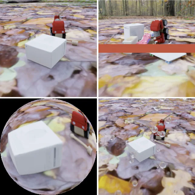 The clean render is the baseline. The bar occlusion is intentionally blunt: it creates a predictable missing region so you can stress-test correspondence reasoning without depending on brittle physical occluders. The fisheye render introduces non-linear distortion that breaks the assumptions many pipelines implicitly rely on. The raindrop render is generated through Blender’s geometry and shader graph so drops refract, occlude, and interact with lighting in a way that actually changes pixel correspondences.